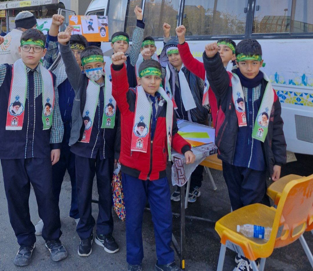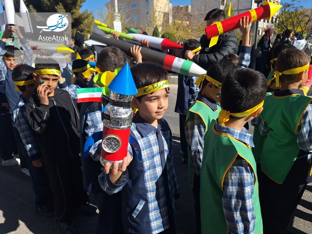 دانشآموزان همچنین کاردستیهایی از موشکهای ایرانی که در جنگ ۱۲ روزه به خاک اسرائیل شلیک و حماسهساز شدند در دست داشتند.