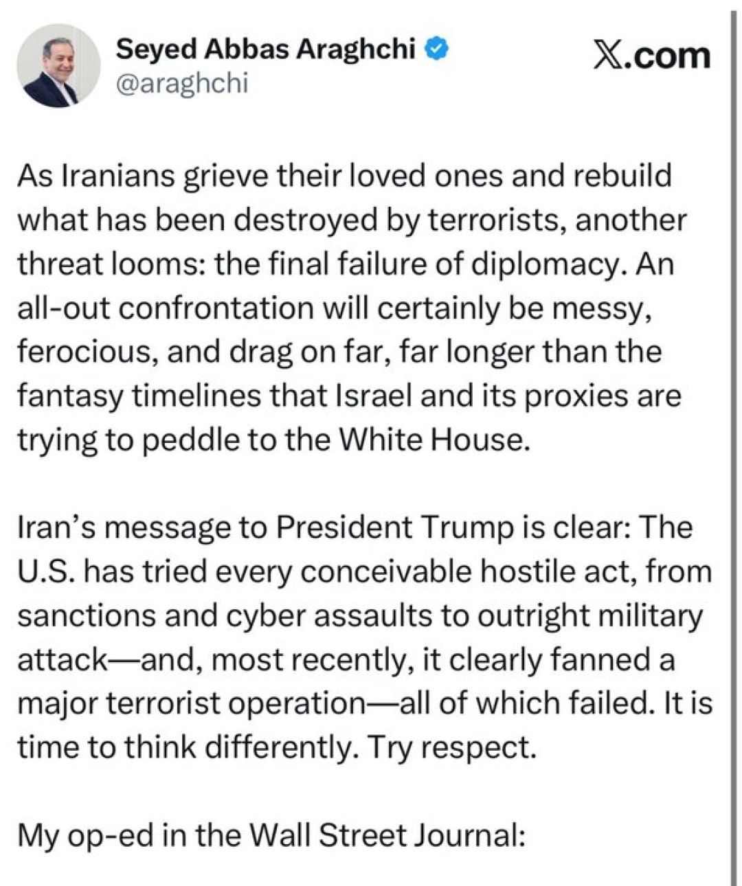 وی تأکید کرد: پیام ایران به رئیسجمهور ترامپ روشن است: ایالات متحده هر اقدام خصمانه قابل تصوری را آزموده است - از تحریمها و حملات سایبری گرفته تا حملهٔ مستقیم نظامی - و اخیراً نیز آشکارا به شعلهورشدن یک عملیات تروریستی بزرگ دامن زده است و همهٔ اینها شکستخوردهاند. زمان آن رسیده که به گونه دیگری فکر کنند: احترام را امتحان کنید.
